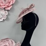 This elegant sinamay disc features soft pleats that gracefully spiral over the right eye, creating a sophisticated and flattering silhouette perfect for a variety of special occasions. Delicate wisps of peacock feathers and superfine trimmed hackle extend in all directions, adding a romantic, airy feel to the design.