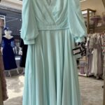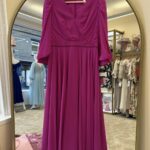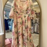 A luxe floral A-line chiffon dress with contemporary V-neckline neckline, pleated detail on the bust, bishop sleeves and beaded belt detail.