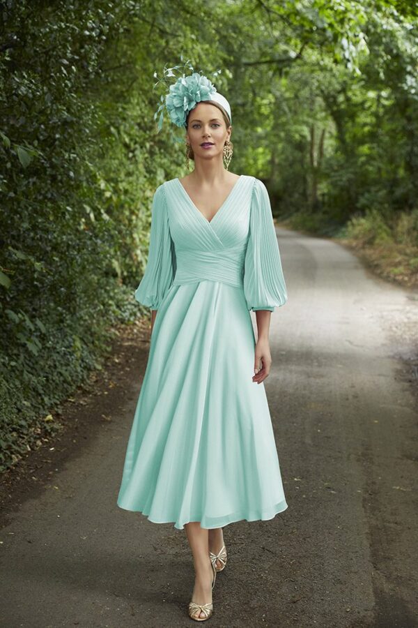 A gorgeous, feminine a-line dress from Veni Infantino. This timeless piece features pleated bishop sleeves, pleated top bodice with a flattering cross over empire line. The dress flows into a plain chiffon skirt. A perfect wedding outfit for mother of the bride and groom, wedding guests or any other special occasion such as the races.