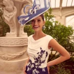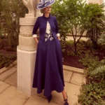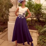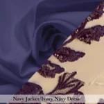 A-line midi length dress with pleated neckline and floral lace on bodice and waist. Complete with contrasting jacket