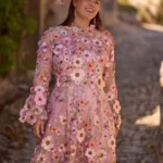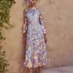 Description: A unique fit-and-flare mid-length crepe dress, featuring a contrasting lace bodice and a plain drop skirt.