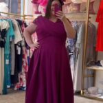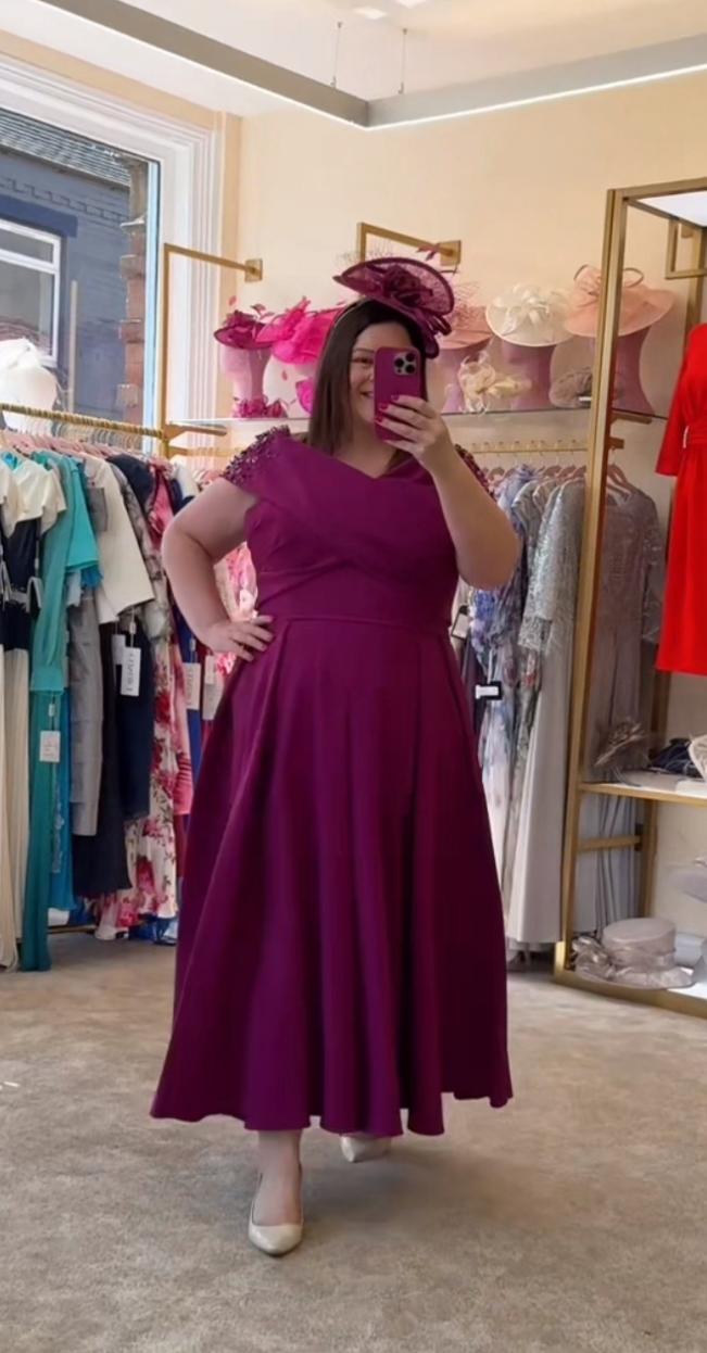 A classic and timeless A-line dress showcasing an off-the-shoulder neckline adorned with beaded cap sleeves and a crossover pleated bodice.