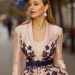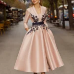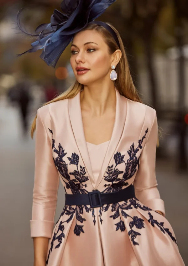 A contemporary A-line mikado dress showcasing floral lace appliqués, a cinched belted waistband, ¾ sleeves, and a flattering V-neckline.