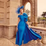 Radiating royal glamour, this structured dress balances pleated detailing with a tailored bodice and asymmetrical neckline—designed for women who want to make an impression.