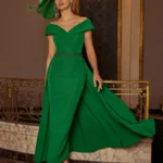 A contemporary fit-and-flare dress that showcases an off-the-shoulder, wide V-neckline, adorned with a beaded skirt and waist, complemented by a half overlay skirt.
